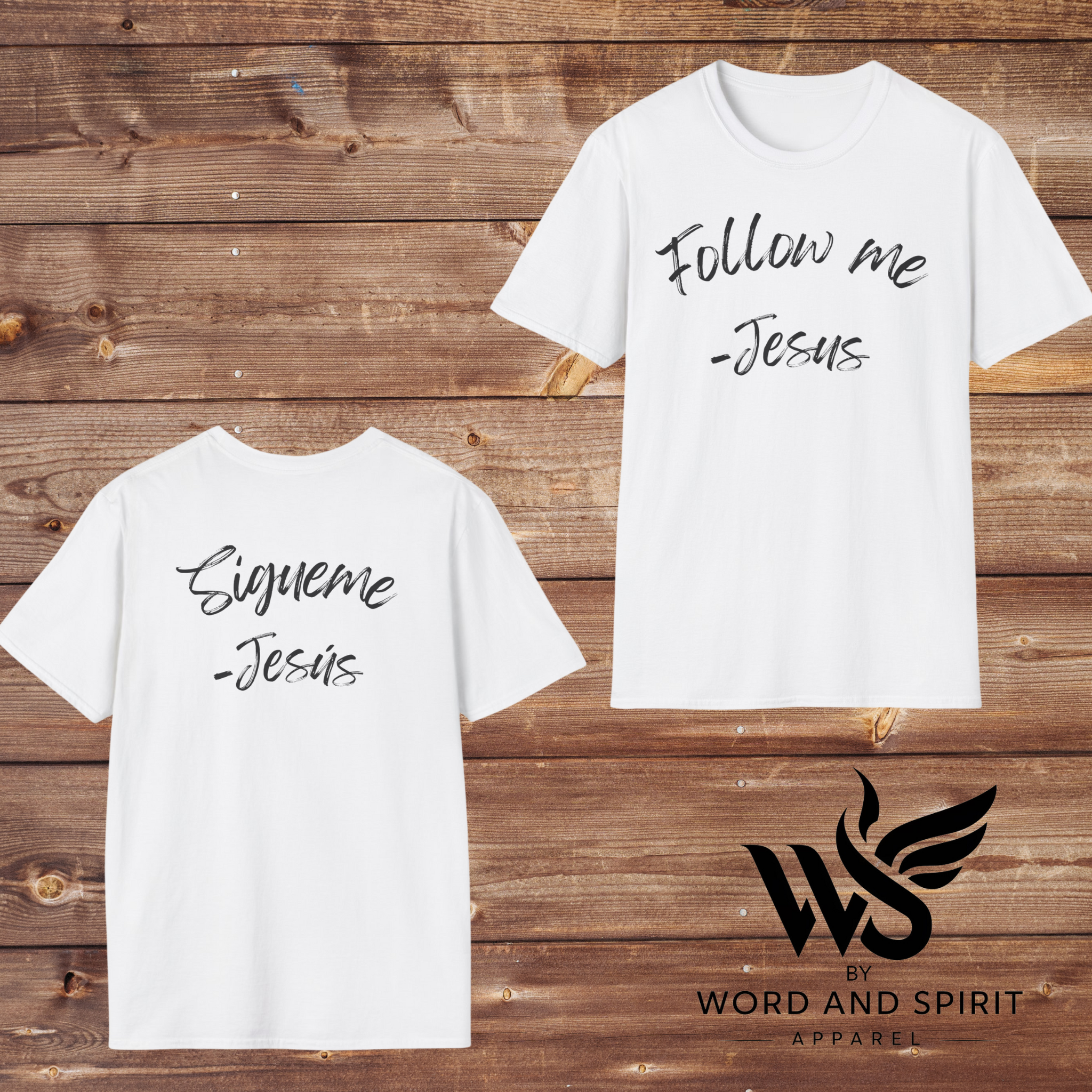 Shop our Bible Scripture T-shirt that says 'Follow Me - Jesus.' This Bible Scripture T-shirt is perfect for those who want to share the powerful message of Christ. This t-shirt features Follow Me in both english and spanish. Made from high-quality materials, this comfortable and stylish shirt is ideal for everyday wear, church events, or spreading the Gospel. Showcase your beliefs with this meaningful Bible Scripture T-shirt, designed to remind others to follow Jesus in all aspects of life."